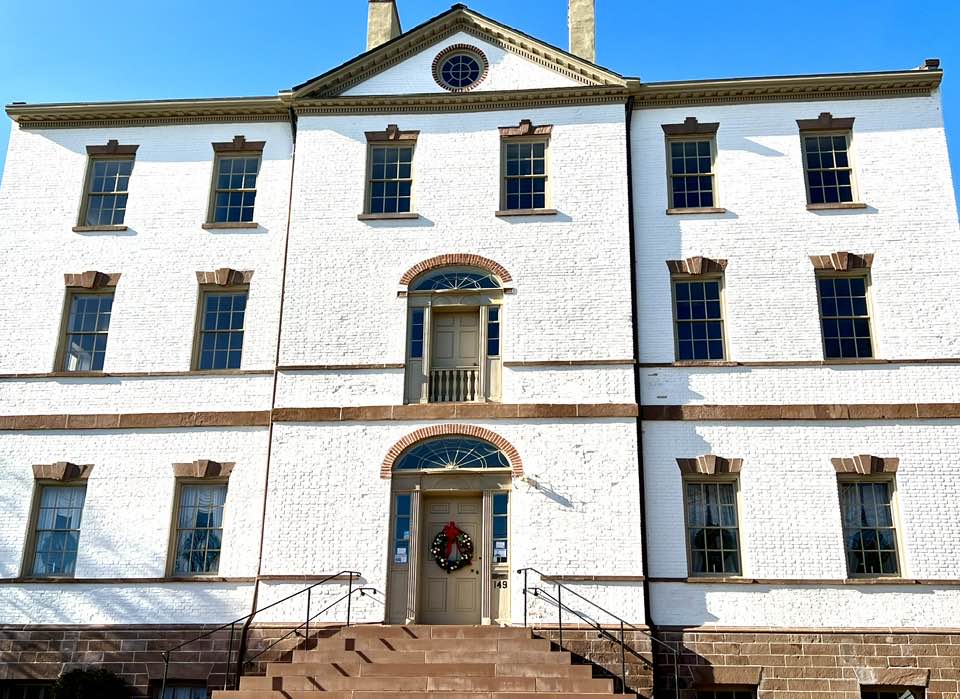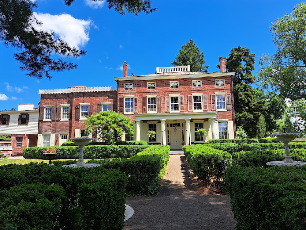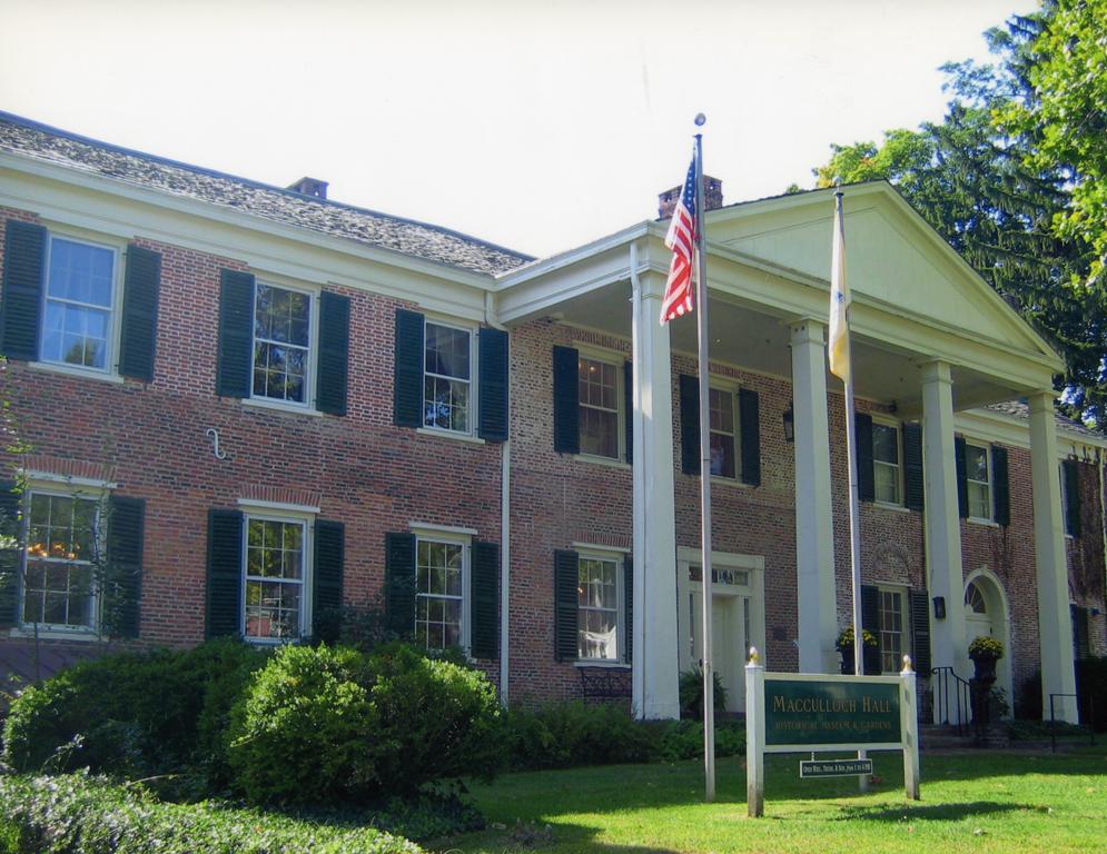 A historic red brick building with dark green shutters and a white-columned portico, featuring an American flag and a sign identifying it as "Macculloch Hall Historical Museum & Gardens" on a sunny day This Federal-style mansion, completed in 1810, showcases early American residential architecture for wealthy families. The building features elegant proportions, decorative details, and period furnishings.