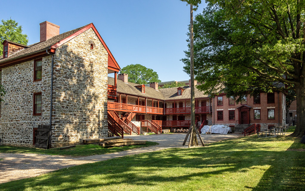 How to visit:The manor operates as a house museum with guided tours. Surrounding Ringwood State Park offers hiking trails and picnic areas. Plan your visit for spring when the rhododendrons bloom around the mansion. The blooming rhododendron gardens and lake views make Ringwood Manor one of the state’s most romantic proposal spots, blending natural beauty with timeless architecture. Historic stone and brick buildings with red trim and wooden balconies, set in a sunny courtyard surrounded by green grass and trees. Built in 1758 to house British soldiers during the French and Indian War, this stone barracks represents military architecture of the colonial period. It's the only remaining colonial barracks in New Jersey.