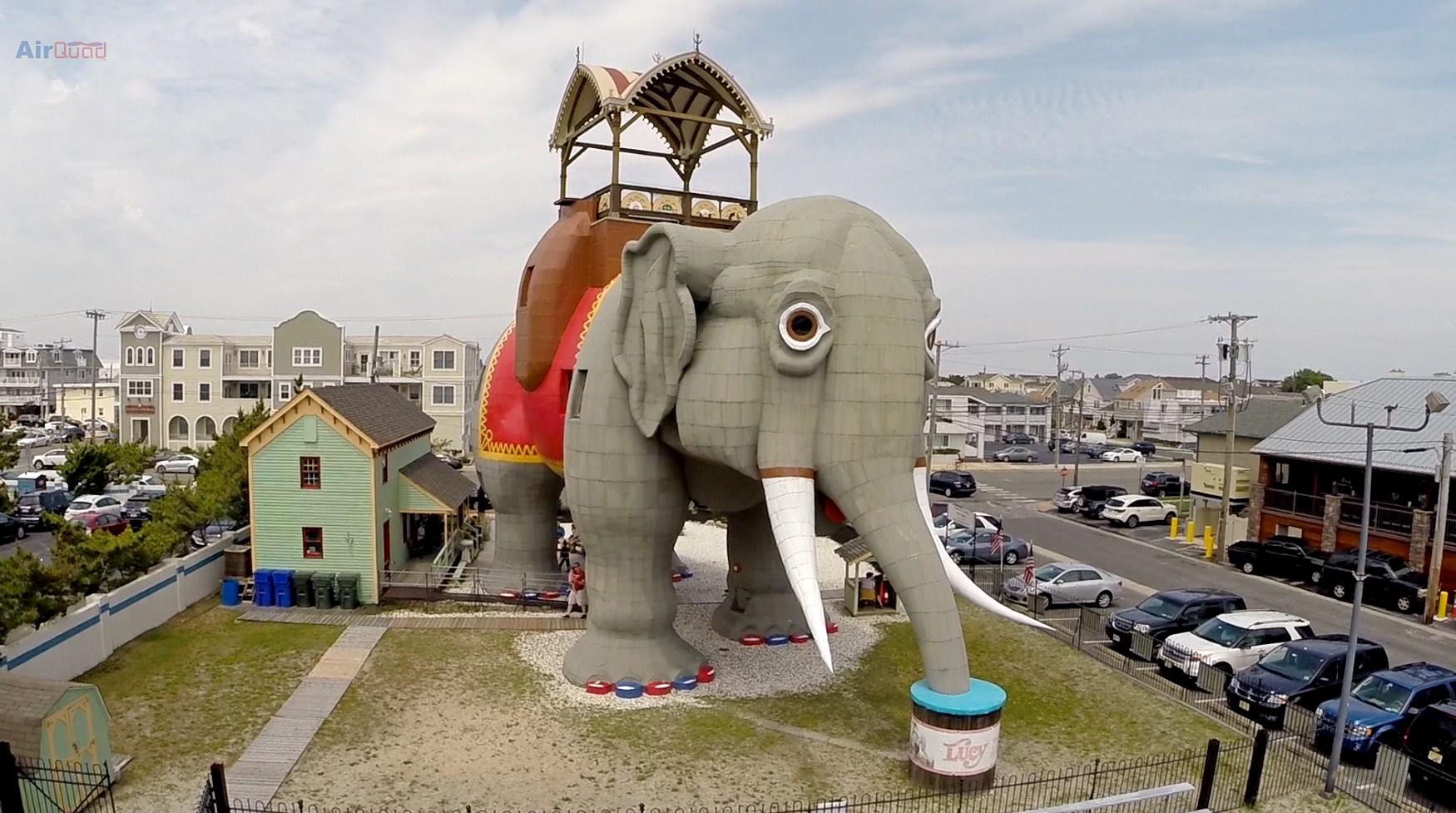 Aerial view of Lucy the Elephant tourist attraction, with visitors nearby and residential buildings in background Built in 1881, Lucy the Elephant is a six-story building shaped like an elephant, representing eccentric Victorian-era promotional architecture. This National Historic Landmark was originally constructed to attract real estate buyers to South Atlantic City.