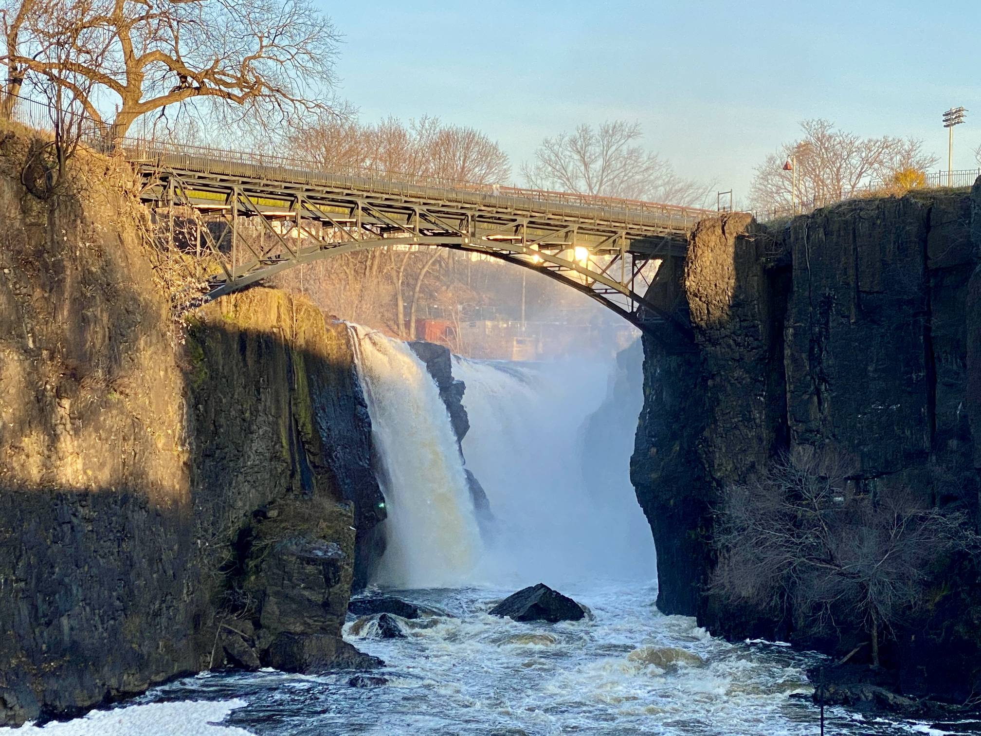 Waterfall cascading under a steel arch bridge between rocky cliffs on a crisp day The historic district surrounding the Great Falls includes early industrial buildings that pioneered American manufacturing. Stone mill buildings and the 1838 raceway system demonstrate how architecture harnessed natural power.