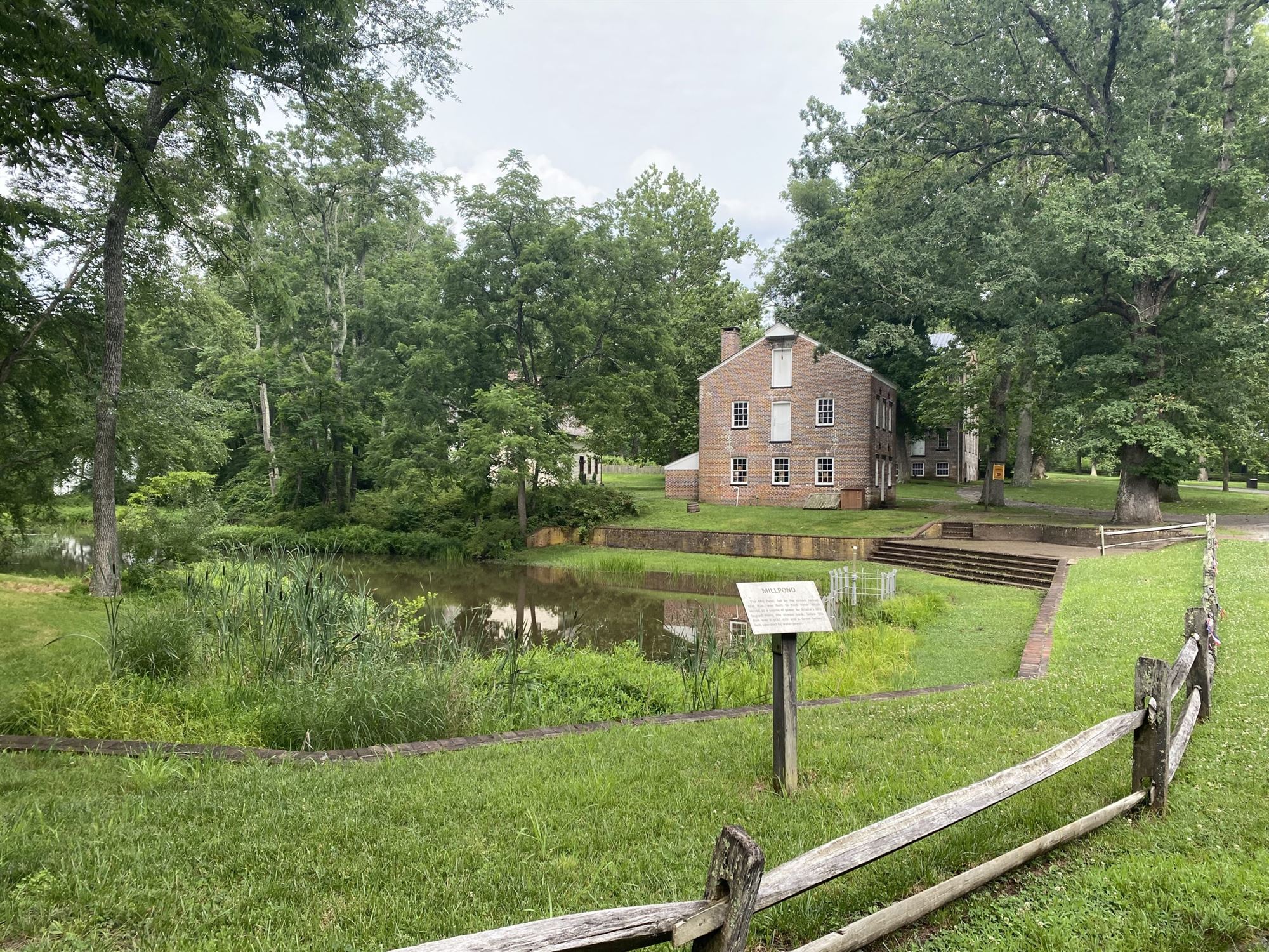 A red brick mill building sits beside a calm pond, surrounded by lush green trees and grass, with a wooden split-rail fence in the foreground This living history museum preserves buildings from the historic Allaire Iron Works, one of New Jersey's most important 19th-century iron manufacturing sites. The village includes workers' housing, a general store, and industrial structures.