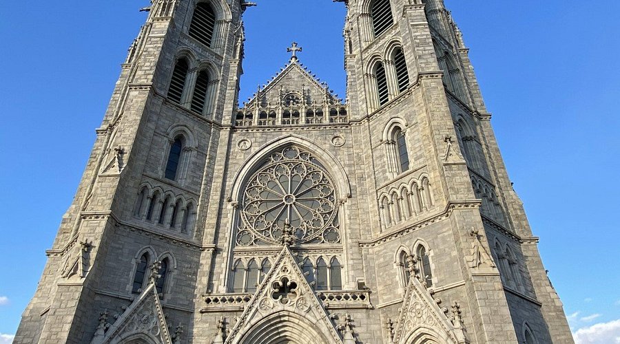 Gothic cathedral with twin towers and rose window, set against a clear deep blue sky This French Gothic cathedral, completed in 1954, ranks as the fifth-largest cathedral in North America. The building took 58 years to construct and features limestone exterior walls, flying buttresses, and towering spires.