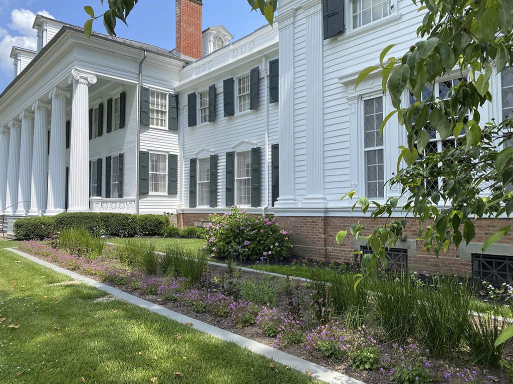 Elegant white colonial-style mansion with columns, dark shutters, and flowerbeds along the walkway New Jersey's official governor's residence, completed in 1835, represents Greek Revival architecture adapted for American tastes. The imposing columned portico announces the building's importance while white-painted brick creates classical elegance.