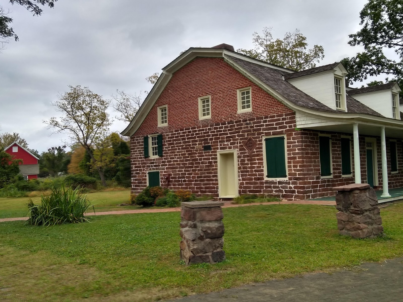 Red brick historic home with green shutters and white trim in a grassy field Built in 1752, the Steuben House is a quintessential example of Dutch Colonial architecture in New Jersey, featuring the characteristic gambrel roof. The house was awarded to Baron von Steuben for his Revolutionary War contributions.