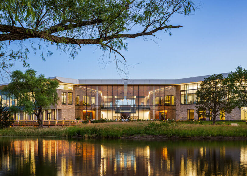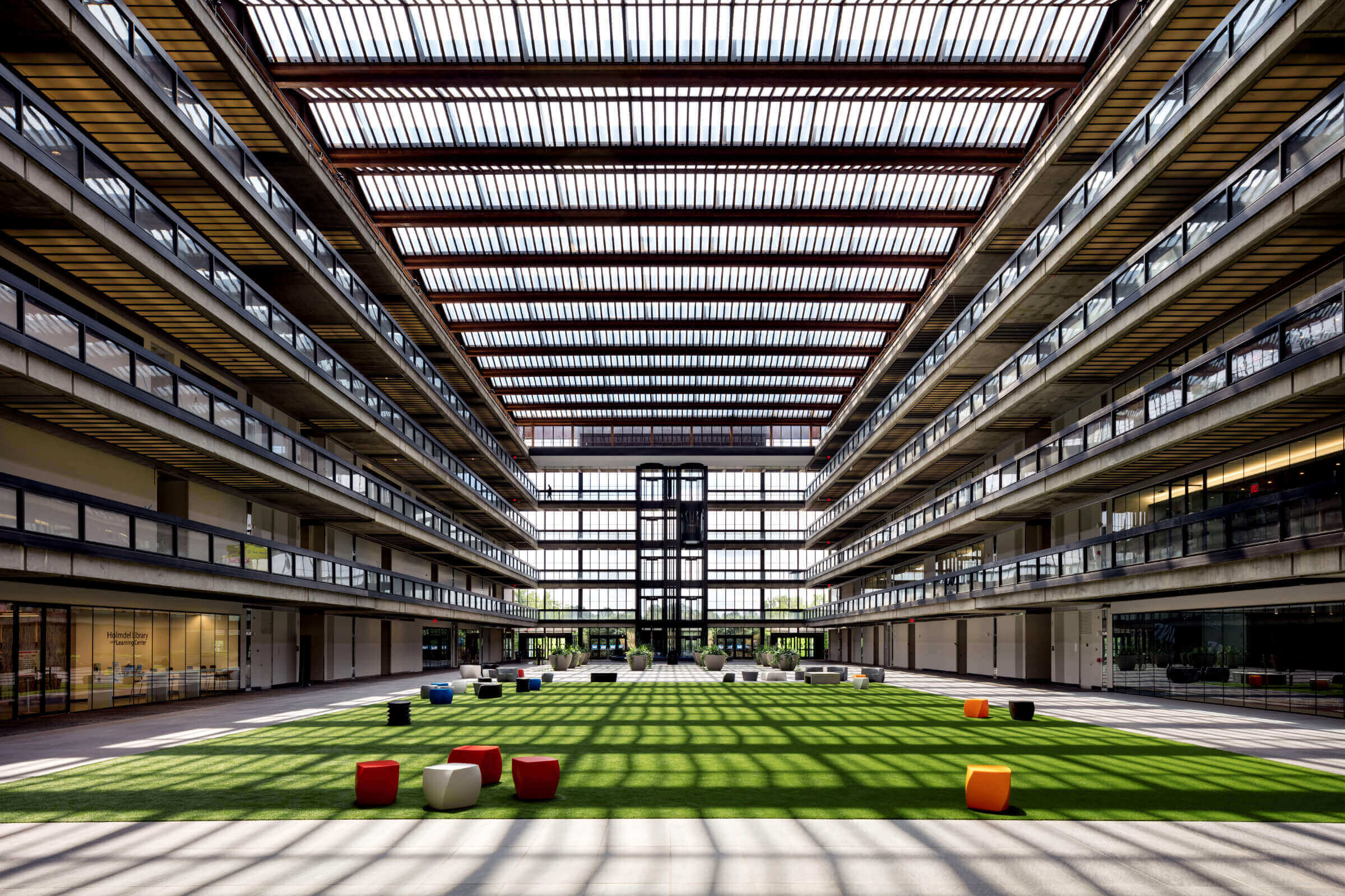The Bell Works multi-story atrium featuring a central lawn, colorful seating, and a glass roof that casts striped shadows on the ground This reimagined former Bell Labs building represents mid-century modern architecture now repurposed as a one-of-a-kind destination for business and culture. The massive structure, designed by Eero Saarinen and completed in 1962, spans 2 million square feet.