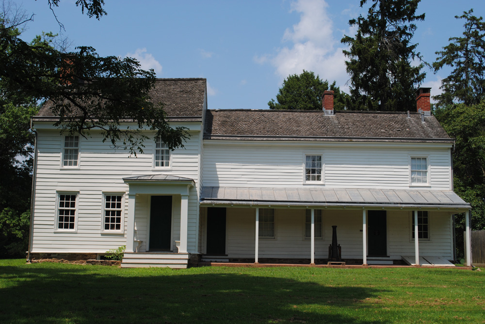 Classic white colonial farmhouse with porch, set against trees under a bright blue sky The 1772 Quaker farmhouse witnessed the Battle of Princeton during the Revolutionary War. The simple Georgian Colonial structure demonstrates Quaker architectural values of plainness and functionality.