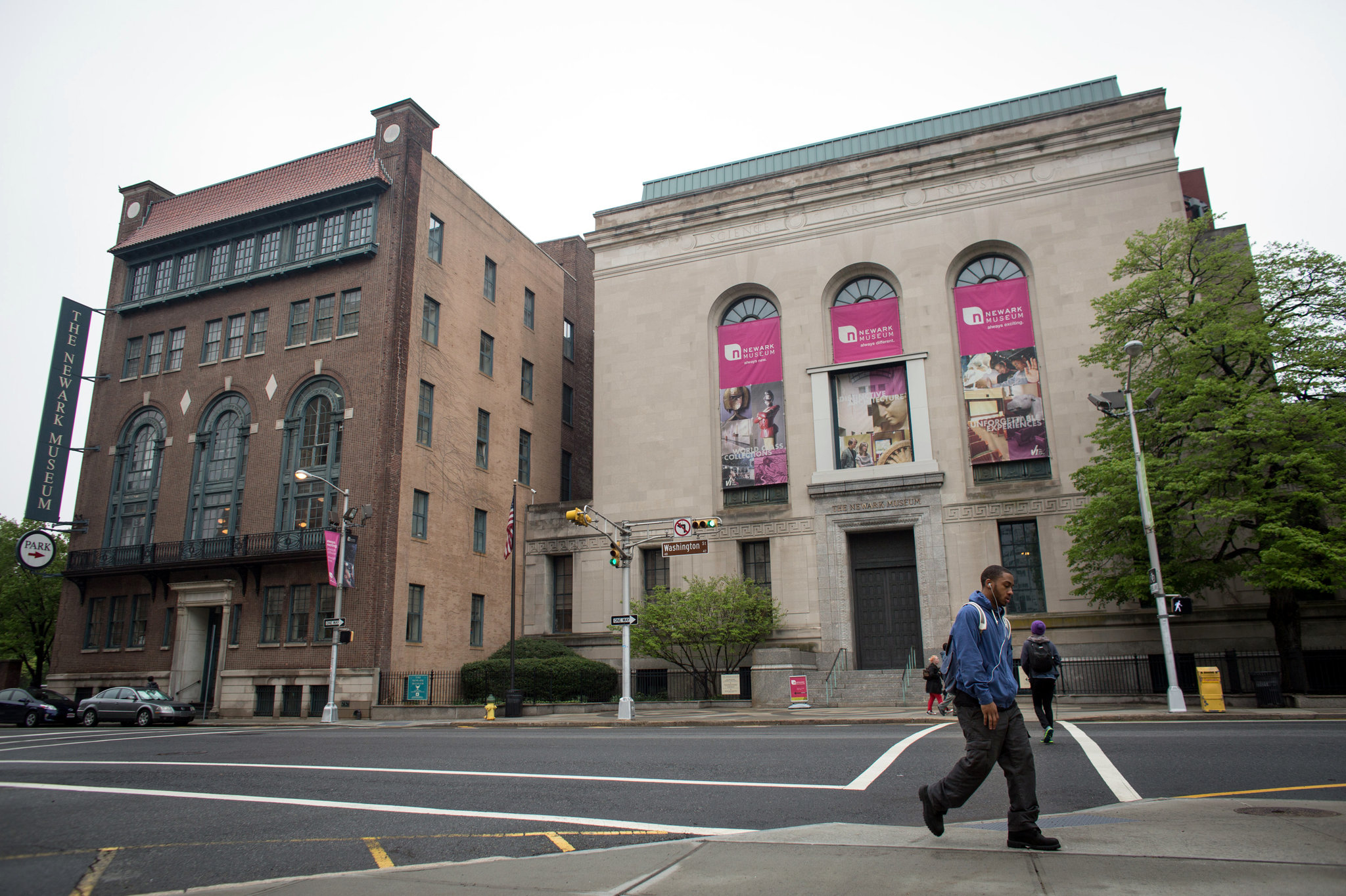 The Newark Museum building with brick and stone wings, pink banners, and pedestrians crossing the street The 1926 main building represents Renaissance Revival architecture, while a 1989 addition by Michael Graves introduced postmodern elements. Together they create an architectural dialogue spanning six decades.