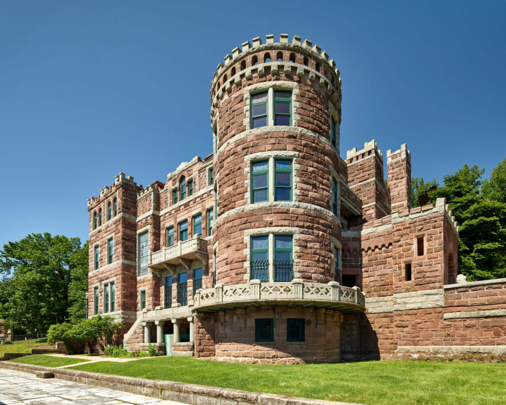 Grand castle-like stone mansion with turrets and arched windows under a clear blue sky This 1892 mansion exemplifies Gilded Age eclecticism, combining elements of medieval castles with Victorian domestic architecture. Built for silk manufacturer Catholina Lambert, the castle commands spectacular views from its hilltop location.