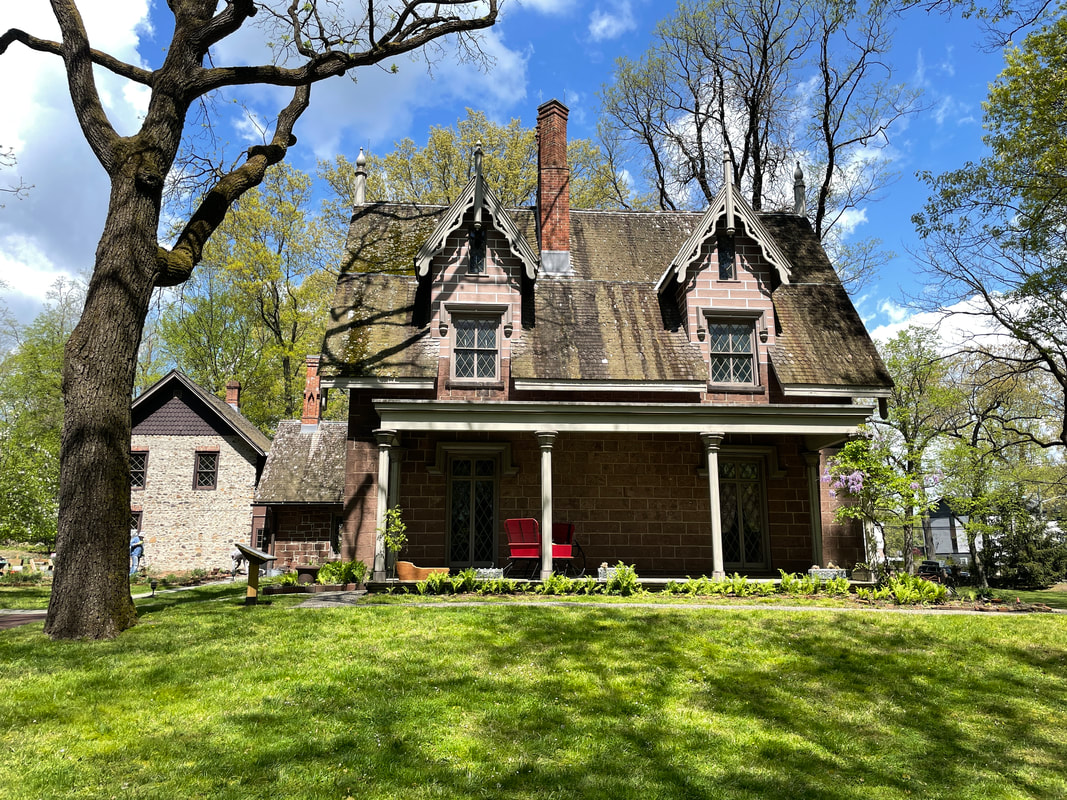 Gothic Revival brick home with pointed gables, front porch, and lush green lawn Built in 1847-48 and designed by William H. Ranlett, this fourteen-room Gothic Revival house museum showcases the architectural style's characteristic features. The yellow sandstone exterior and pointed arch windows create a distinctive appearance.