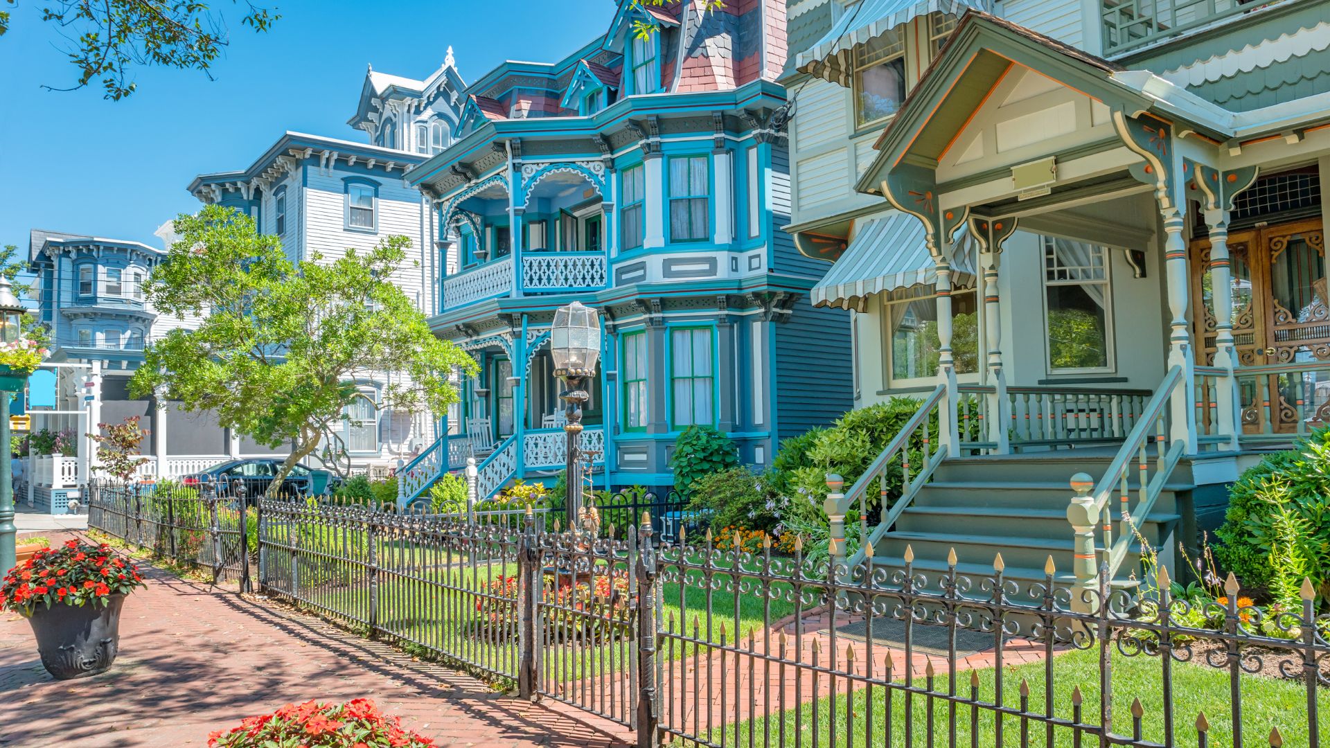 Row of historic homes featuring bright blue and white facades, decorative woodwork, and lush green lawns Cape May contains over 600 preserved Victorian buildings, making it one of the largest collections of 19th-century architecture in America. The town is known for its beautifully preserved Victorian architecture, featuring elaborate gingerbread trim, wraparound porches, and pastel color schemes.
