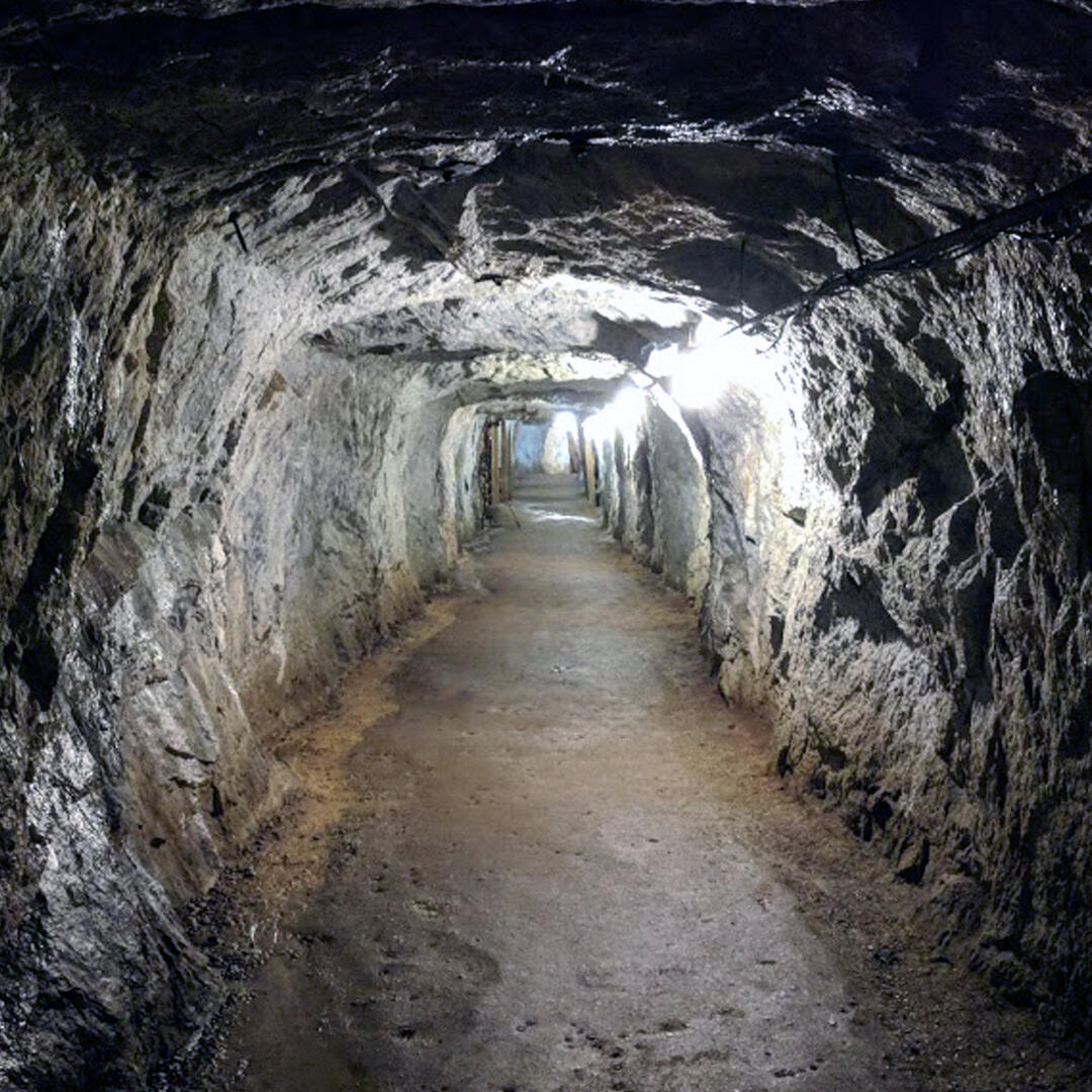 A narrow, rough-hewn rock tunnel with an arched ceiling, lit by artificial lights that cast shadows on the uneven walls and dirt path leading into the distance The original mine buildings and tunnels showcase industrial architecture adapted to mining operations. The complex includes above-ground processing buildings and the famous Rainbow Tunnel, lit to display fluorescent minerals.